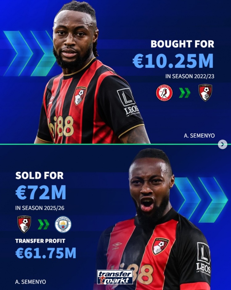 1月10日讯 曼城已经官宣签下塞梅尼奥,《转会市场》统计显示这也是伯恩茅斯近年来通过转卖盈利最多的一笔交易(单位:欧元)。